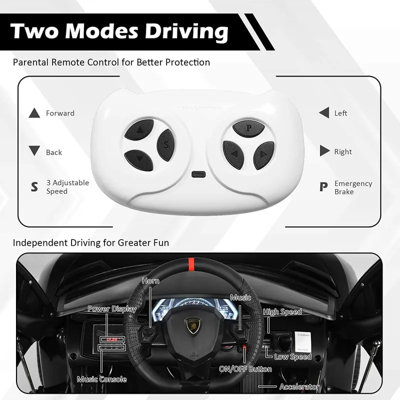 This 12V child electric ride on car is specially designed for your kid! The great safety system, including safety locks on the double doors and safety belt can protect your kid from the risk of falling down. Designed with two driving modes, the car can be controlled by your child through the steering wheel and foot pedal or by the parent using the included remote control. Single child design with foot pedal accelerator, cool LED lights, and a built-in horn are perfect for toddlers to get their first taste of realistic driving. Besides, the MP3 function and the USB interface is helpful for early childhood education. In addition, four wheels are wear-resistant and explosion-proof, making it suitable for a variety of pavements. When the car is fully charged, your baby can continuously drive it for 60 minutes. What’s more, the stylish outlook and design of this toy car can give your for years of fun play. It is sure to be the perfect gift on birthday or other festivals and will bring your children precious childhood memories. If you are looking for such a product, do not hesitate to buy it! Two Modes Operation: Rechargeable ride on electric car enable your kids to enjoy a realistic driving experience by means of power button, forward/reverse switch, speeds switch and foot pedal. It also comes with a 2.4G remote control that allows parents to control moving direction and speed. Safe and Steady Driving Experience: Safety always takes priority in any environment, in particular the kids toy. Therefore, this kids ride on car adopts shock absorber spring in rear wheels, minimizing the shock feeling and ensuring a smooth driving. Multiple Functions for Endless Fun: Considering that kids may get tired with driving, the ride on car is built with multiple entertaining functions to cheer them up. Loud horn add more fun while the dynamic music boosts their vigour. Besides, there is a USB interface, TF slot, designed to provide a great number of music your kids prefer. Realistic and Attractive Design: Designed with LED headlights, ddashboard gauges, accelerator pedal, safety belt, and the hydraulic powered doors that swing open just like the real vehicle, this electric vehicle toy vividly simulates a real car to give your little one a super realistic driving experience. Perfect Toy to Accompany Your Kids: Precious interesting driving memory will be remained forever, that is one of important reason you choose cool ride on car as a gift for your dear children. Plus, safe enough materials leave you no worry about using reliability.