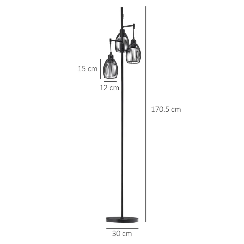 170cm Industrial 3-Light Floor Lamp, Dimmable Standing Lamp with Steel Lampshades for Living Room, Bedroom, Dinging Room, Study, Black