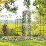 The 220cm tall garden trellis offers ideal space for various vine plants to grow vertically, including cucumbers, grapes, peas and tomatoes. Besides, it also serves as an impenetrable barrier, shielding your delicate greenery from the potential harm of curious animals. Crafted from galvanized steel, the plant trellis boasts an unparalleled resilience against rust and exceptional stability to support heavy plants. Thanks to the long legs, effortless insertion for stabilization is seamlessly accomplished. What’s more, the wire lattice grid panel allows for the arrangement of multiple trellises, enabling you to create a myriad of frame combinations that will truly rejuvenate your garden. Featuring easy-to-lock connector, you can effortlessly set the trellis to your desired configuration. Besides, the decorative climbing trellis showcases a timeless arch top and multiple vivid patterns, including birds, flowers and leaves, adding a touch of elegance to your cherished outdoor setting. If you are looking for a Metal Garden Trellis like this, do not hesitate to place an order! Heavy-duty Construction: The decorative garden trellis is constructed of galvanized steel, ensuring unrivaled sturdiness and rust resistance to hold heavy plant for longer time. The trellis features 28 cm long legs, allowing for effortless insertion into the ground, providing a stable foundation. Perfect Support for Vertical Growth: With impressive heights of 220cm, the metal trellis offers an expansive area for your climbing plants and vines to reach new heights. By providing an abundance of vertical space, your plants can thrive as they eagerly stretch towards the sun’s nourishing rays. 3-in-1 Utility Design: Apart from being used as a plant support for climbing plants. The 2 pack trellis set can be combined to a garden fence, ensuring the protection and privacy of your cherished plants. Plus, you can connect 2 or more trellis in A-shape frame for growing cucumbers or other climbing vegetables. Elegant and Customizable Decor: Designed with enchanting birds, flowers and leaves, the tall garden fence will effortlessly add a touch of timeless elegance and retro charm to your garden, lawn, or yard. Moreover, you have the freedom to arrange more trellises to different layouts according to your unique requirements. Simple Assembly Process: Coming with complete components and a detailed instruction manual, the assembly process of the wire lattice grid panel is a breeze. Besides, the 2 pack fence trellises are designed with effortlessly interlocked connector, allowing for quick setup.