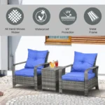 3-Piece PE Rattan Wicker Garden Furniture Patio Bistro Set Weave Conservatory Sofa Storage Table and Chairs Set Blue Cushion Grey Wicker