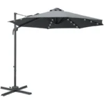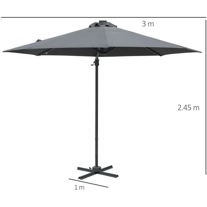 Transform your outdoor space with the Outsunny 3m Roma Grey Cantilever Parasol. This versatile garden essential features 28 solar-powered lights, casting a warm, inviting glow for those delightful evening gatherings. Boasting a 360° rotation and four-position tilt mechanism, this parasol offers dynamic shade solutions to suit the sun’s position throughout the day. Its robust aluminium frame, reinforced by eight sturdy ribs, guarantees resilience and durability. Day or night, make every moment outside count with this captivating and practical parasol.