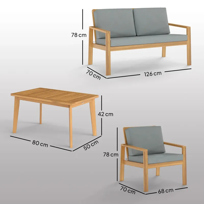 - Solid wood frame: Crafted from 100% acacia wood with a sleek varnish finish, this outdoor garden furniture set ensures long-lasting use. Each seat is designed to support up to 160 kg