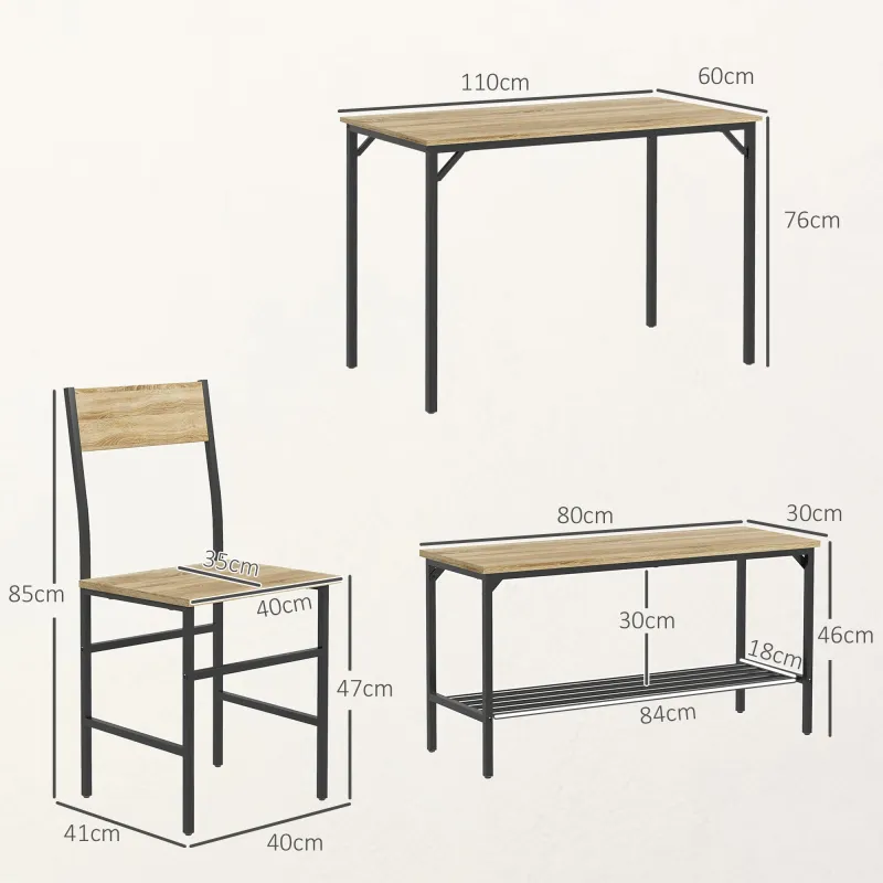 Make mealtimes feel special with this stylish 4-piece dining set from HOMCOM. Designed to comfortably seat four, it includes a rectangular table, two chairs and a two-seater bench – perfect for family dinners or casual gatherings. The natural wood-effect finish and clean lines bring a timeless feel that fits beautifully into any kitchen or dining area. With space-saving features and practical touches, this set is as functional as it is good-looking.