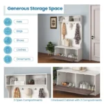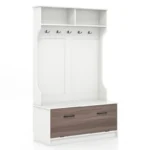This multipurpose hall tree features generous storage space, including 5 double hooks, 2 open shelves and 1 enclosed cabinet with 2 pneumatic rods. You can use it to store your bags, hats, clothes, ornaments and other stuff. Meanwhile, there is a sitting bench for you to conveniently change shoes. The bench bears a weight of up to 200 lbs. Its solid frame and non-slip foot pads ensure overall sturdiness. And the additional anti-toppling design helps to firmly attach it to the wall for more stability and security. You don’t need to worry about its sudden collapse. If you are looking for a multipurpose hall tree like this, do not hesitate to place an order! More than a Clothes Rack: This coat rack organizer is a perfect combination of 5 double prong hooks and 1 sitting bench, which can fulfill your daily requirements. The bench is ideal for sitting for changing shoes or having a rest, which holds up to 200 lbs. Sufficient Storage Space: This home storage organizer is a perfect choice to keep your room tidy and clean. 2 top compartments are nice for you to place your belongings, such as clothes, hats, storage baskets and so on. And there is 1 enclosed cabinet with 2 compartments to store your shoes, pillows or blankets. Safe and Reliable Structure: Thanks to its solid frame and anti-toppling device, the hall tree will stay stable and steady on the ground. And it’s not easy to wobble or collapse. Furthermore, the anti-slip foot pads add more sturdiness and protect the floor from being scratched. Versatile and Considerate Design: Beautiful wood grain and classic color make it a perfect decoration for your entryway, hallway or bedroom. In addition, the premium metal pneumatic rod and magnetic catch allow you to easily open or close the cabinet door. Space-saving Design and Easy Cleaning: Measuring 100 cm x 40 cm x 160 cm (L x W x H), this space-saving hall tree occupies less floor space and helps you make full use of limited space. What’s more, the smooth surface can be effortlessly wiped clean with a soft cloth.