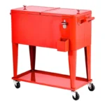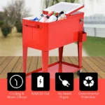 This portable ice trolley is great for parties, BBQs etc where cool drinks are just what is required. Made from durable steel with red painted finish, this is the perfect companion to any outdoor gathering. This 76L cooler has twin openings for easy access both sides and features convenient twin handles. With a drainage hole located in the back to quickly drain any excess water while a convenient bottle opener with catcher is located to the front. With four castors, of which 2 have locking ability , this trolley is portable. A bottom useful shelf can be used to hold accessories such as mixers or glassware. This is a very versatile Ice trolley. A great accessory for any outdoor gathering, don’t hesitate to buy it! Effective Cooler Cart: The internal tank of the rolling cooler cart is made of food grade PP. Meanwhile, the insulating layer in the box is made of high quality foam which can effectively maintain the temperature of the food for up to 72 hours, regardless of whether it is hot or cold. Practical Two-compartment Design: This cooler cart with 80 Quart capacity has two cooling compartments with double-sided lids, which allows you to keep food apart. Hence, you can put hot dishes in one compartment and cold drinks in the other. This design makes the cooler cart very practical for versatile uses. Free Movement with Wheels: Four wheels with 360 degree rotation and two side handles provide you with great convenience to move the cart effortlessly. Better yet, 2 wheels are equipped with brakes that are easy to stop, keeping the cart in place. Excellent Material for Stability: The body of the cooler trolley is made of iron, so that it is very stable to store more drinks and other food safely. In addition, the surface of the iron sheet is powder-coated, which endows the cart with excellent rust resistance. Perfect for Parties: A shelf, a holder for the bottle cap and a bottle opener offer you more convenience. Our portable cooler cart is definitely a must for birthday celebrations, parties and other occasions.