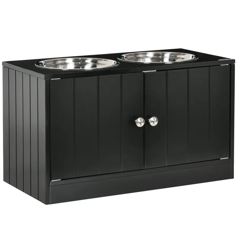 Raised Pet Feeder, with Two Bowls, Storage – Black