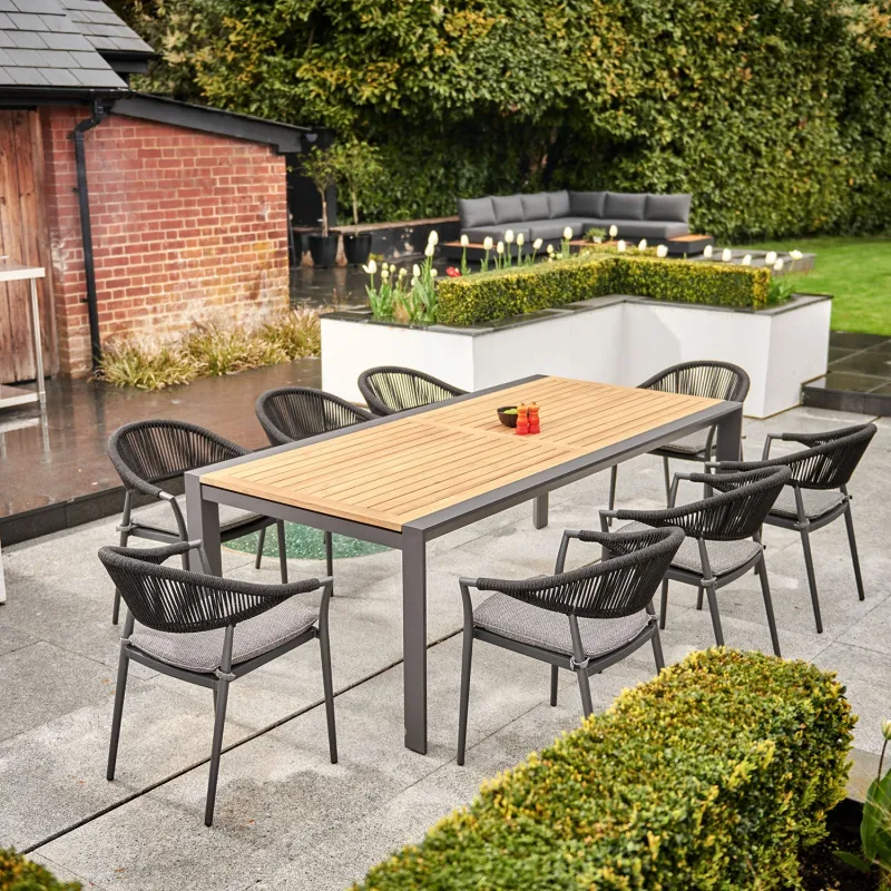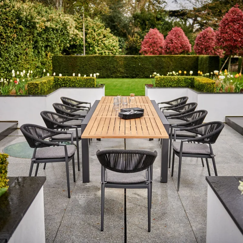 Cloverly 10 Seat Rectangular Extending Dining Set with Teak Table in Charcoal