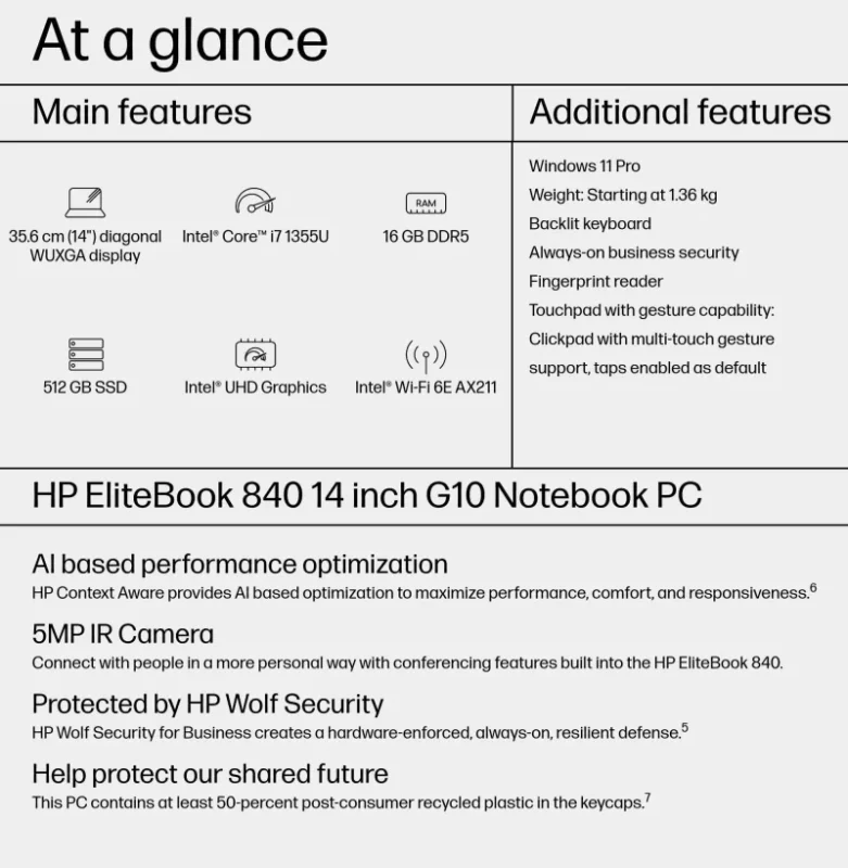 HP EliteBook 840 14 inch G10 Notebook PC Intel® Core™ i7 i7-1355U Laptop 35.6 cm (14″) WUXGA 16 GB DDR5-SDRAM 512 GB SSD Wi-Fi 6E (802.11ax) Windows 11 Pro Silver