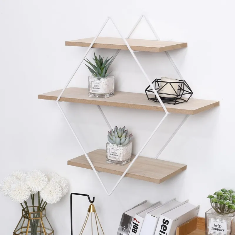 Stylish Diamond 3-Tier Wall Shelf with White Iron Rings
