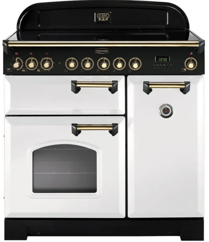 Rangemaster Classic Deluxe CDL90ECWH/B 90cm Electric Range Cooker with Ceramic Hob – White/Brass Trim