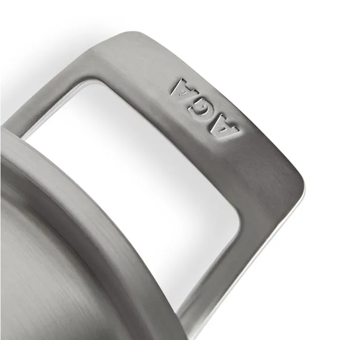 The ergonomic AGA laser etched handles remain cool on stove top. Featuring a closed rim for easy pour. Suitable for dishwashing.