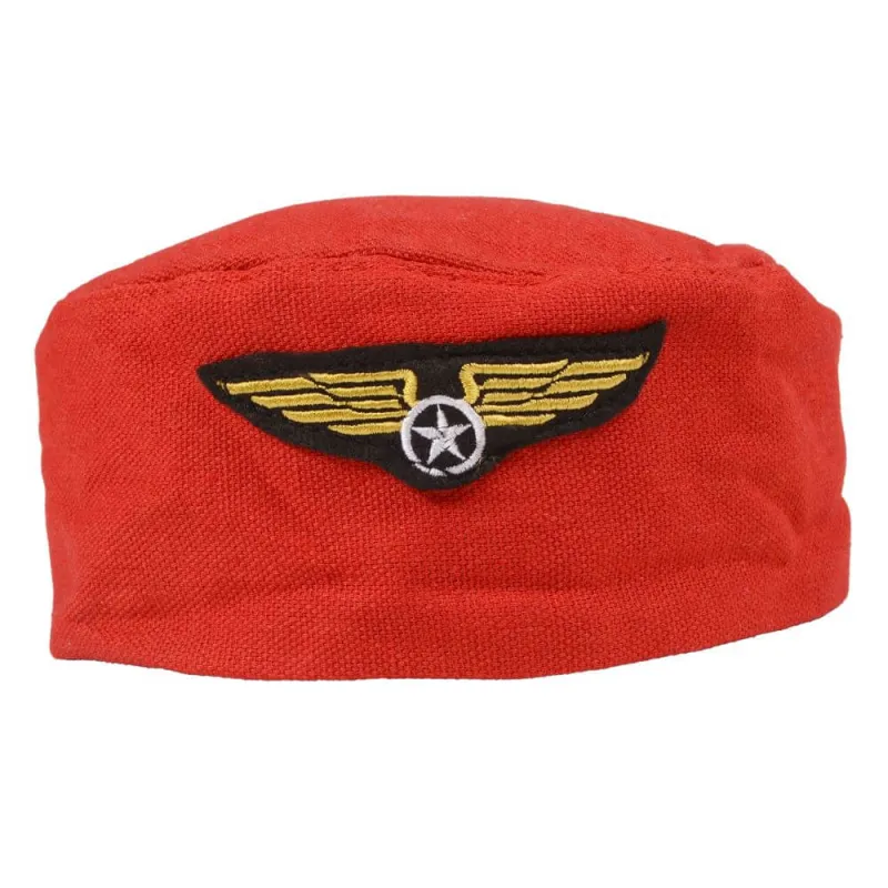 The stewardess cap is made from red fabric with gold wings and a silver star badge. One size fits most adults.