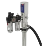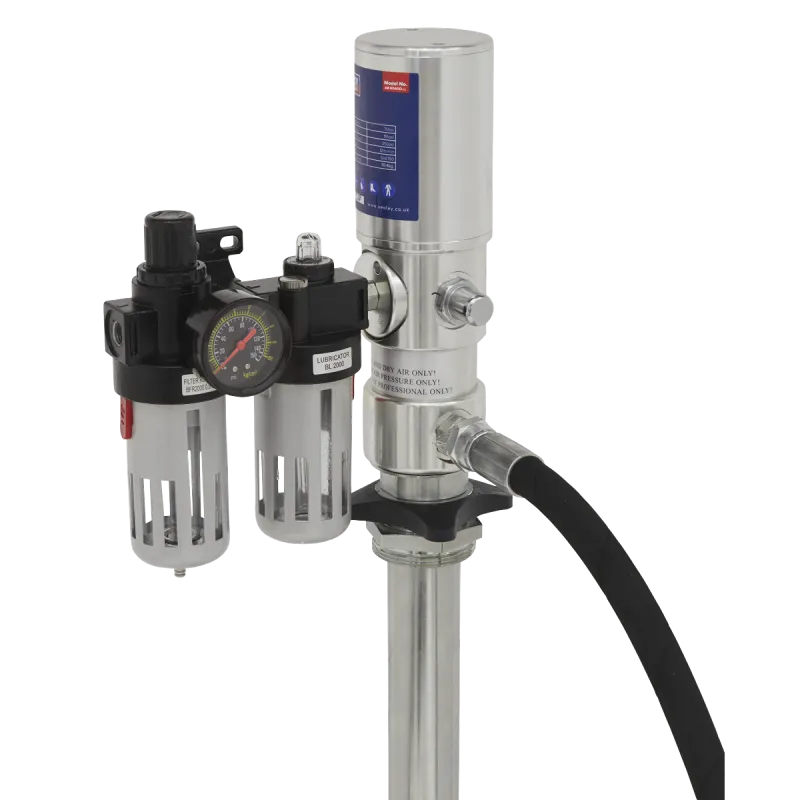 Air operated 3:1 double acting pump for barrels or tanks with 2″BSP fittings. Pump is supplied with air management system and connected to a 940mm rigid suction probe with non-return valve. Features hose for attachment to digital oil meter (Model No. AK4565D supplied) or to optional retractable hose reel (Model No. AK4567D). Suitable for use with engine, hydraulic, synthetic, gear and transmission oils up to SAE150.