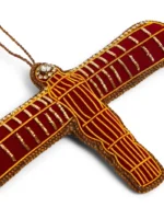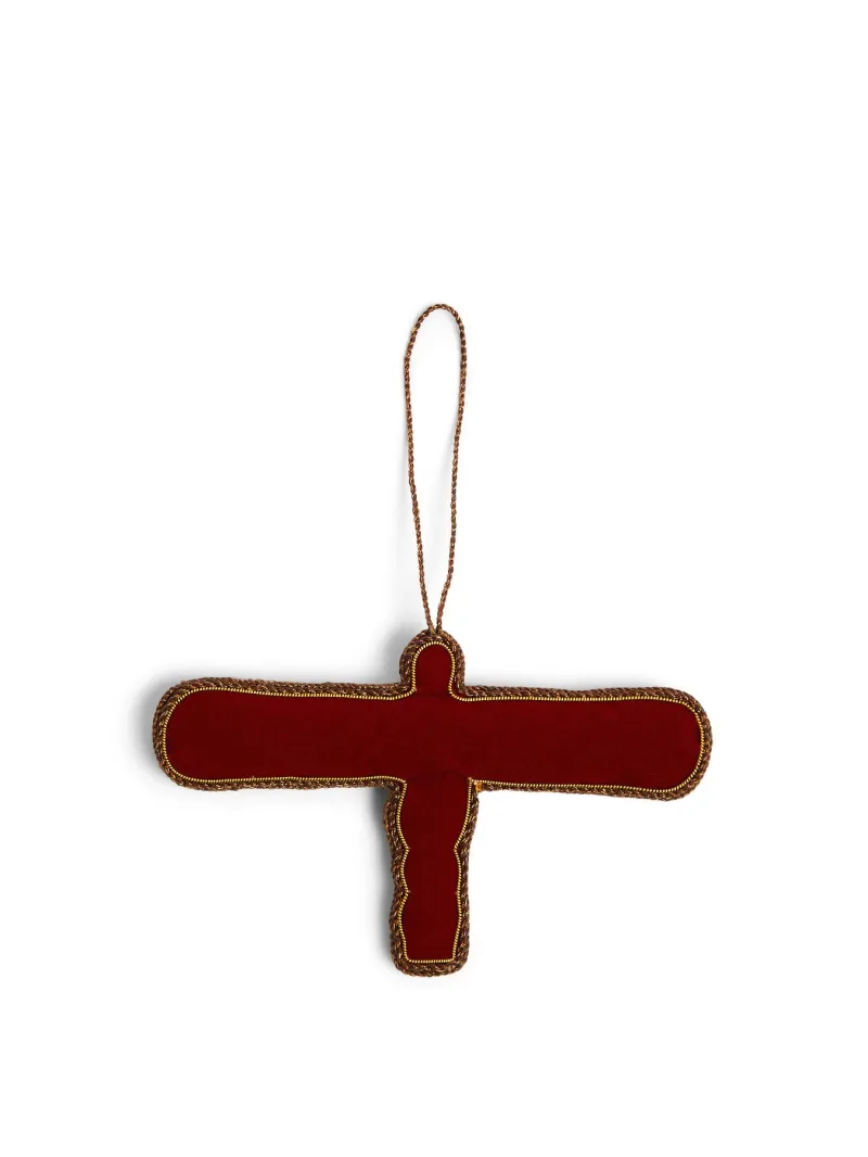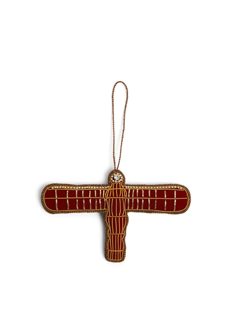 Hand embroidered in antique gold threadwork on a velvet fabric, this Angel of the North decoration is embellished with small glass crystals.