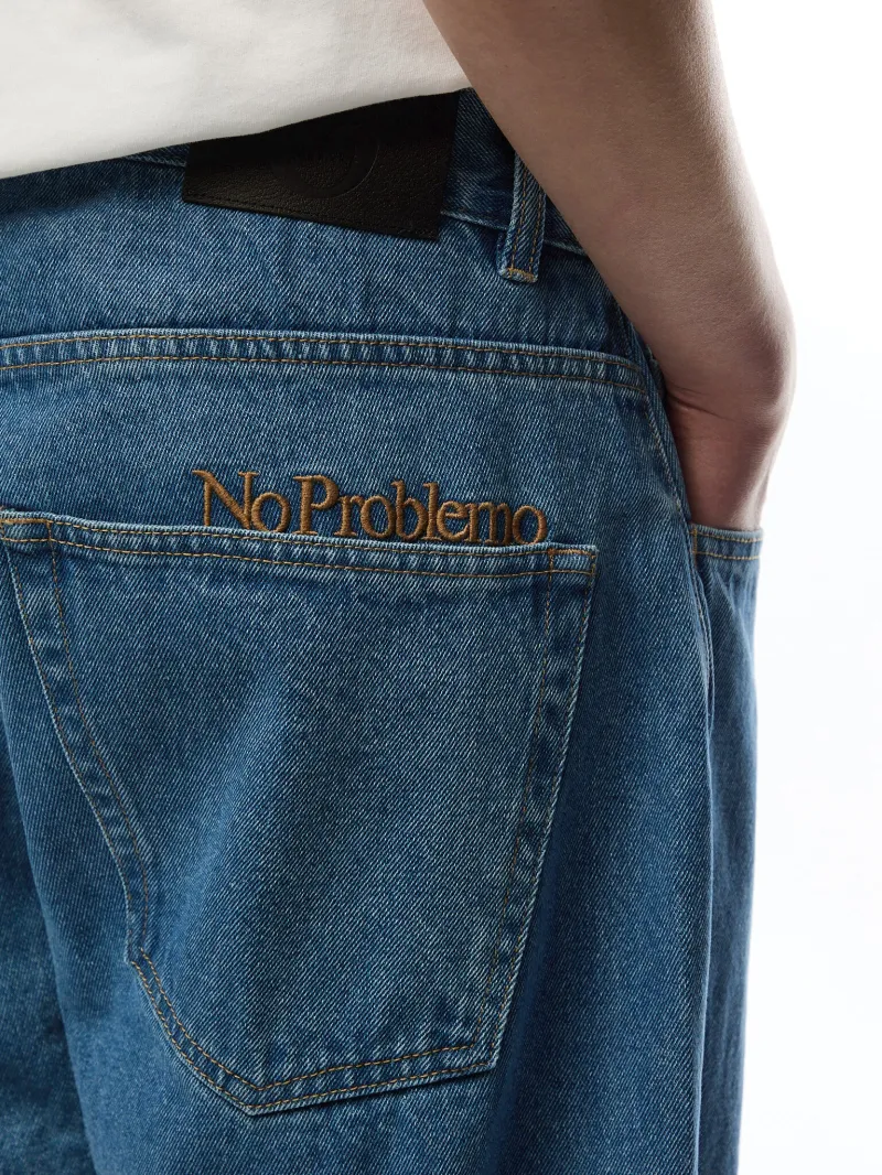 The Bagi Jeans are a unisex vintage-cut 90s style skate jean with a super baggy fit, featuring a ‘No Problemo’ embroidery on the back, along with leather patch.