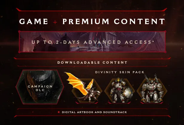 Included DLCs Base Game (digital code), Up to 2-Day Early Access, Campaign DLC, Digital Artbook and Soundtrack, Divinity Skin Pack