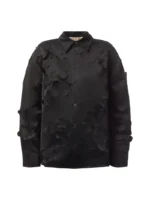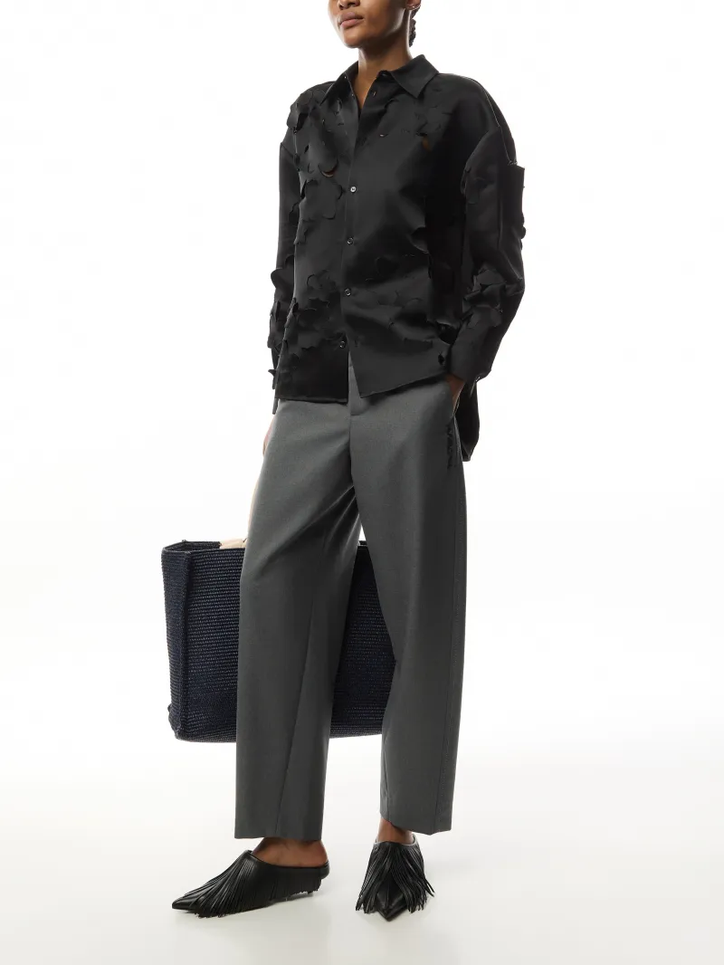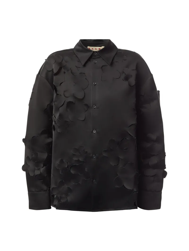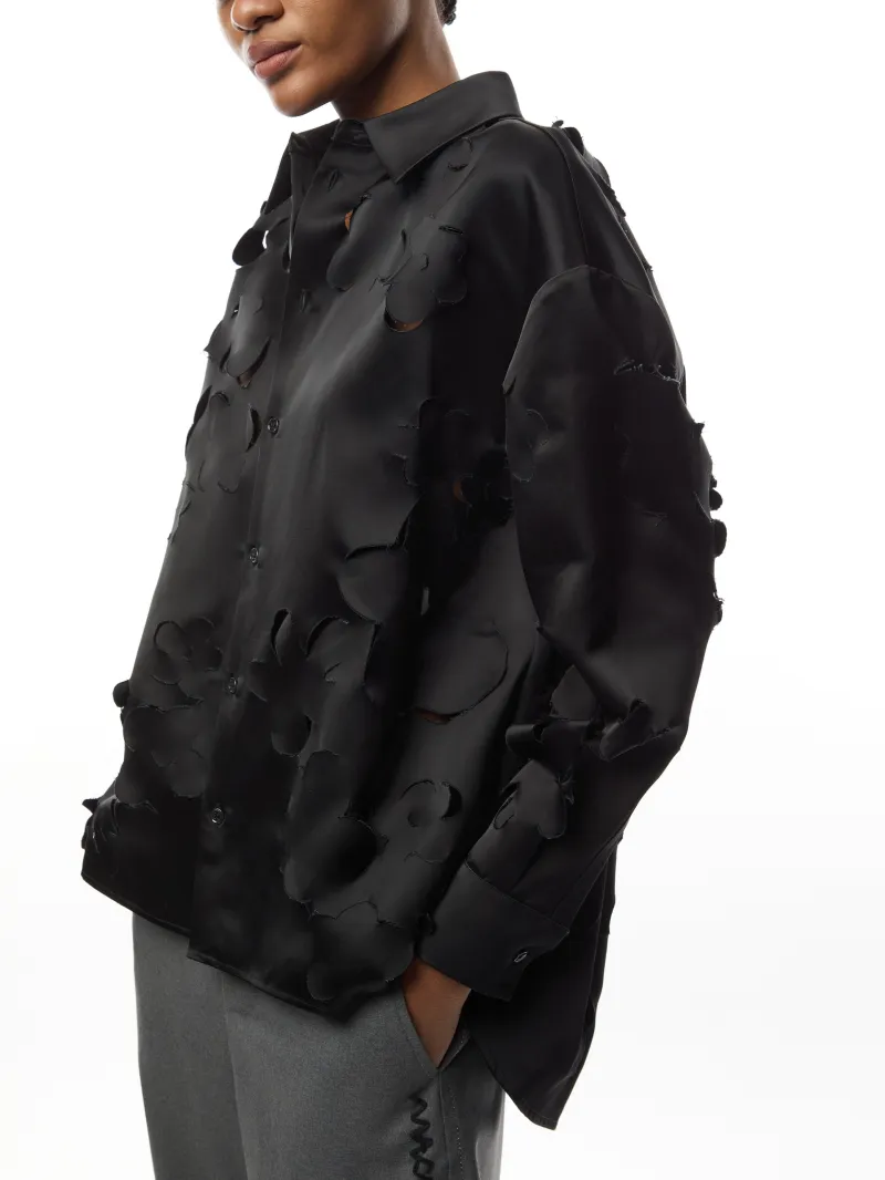 Long sleeved duchess satin shirt with 3D cut out flowers on the front. The cocoon silhouette has a gathered yoke at the back and button up cuffs, with visible buttons along the placket.
