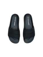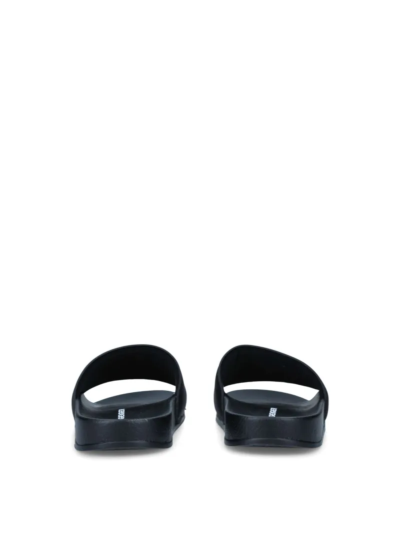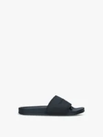 The Ibiza slider sandals are a simple summer style. The padded matte black strap features an embossed logo and sits on a textured black sole. Wear with shorts for a warm weather look.