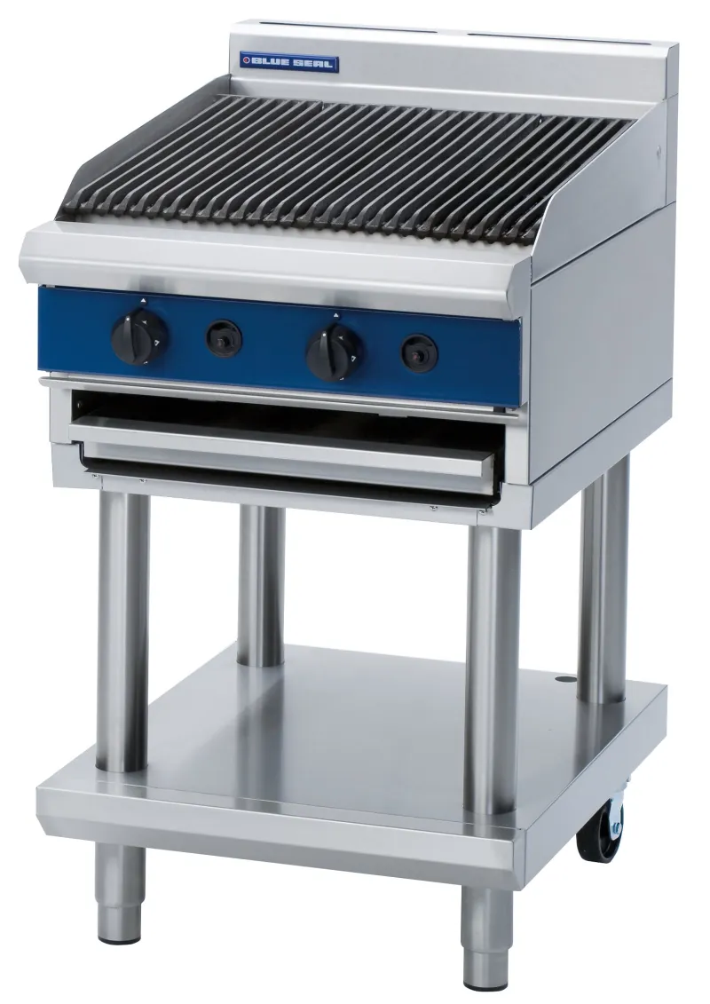 Heavy duty 600mm stand mounted gas chargrill with fully stainless steel 19.8kW burners and lift out parts for easy cleaning access.