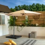 At the bottom of this cantilever parasol is a steel cross section for a weighted parasol base (not included).