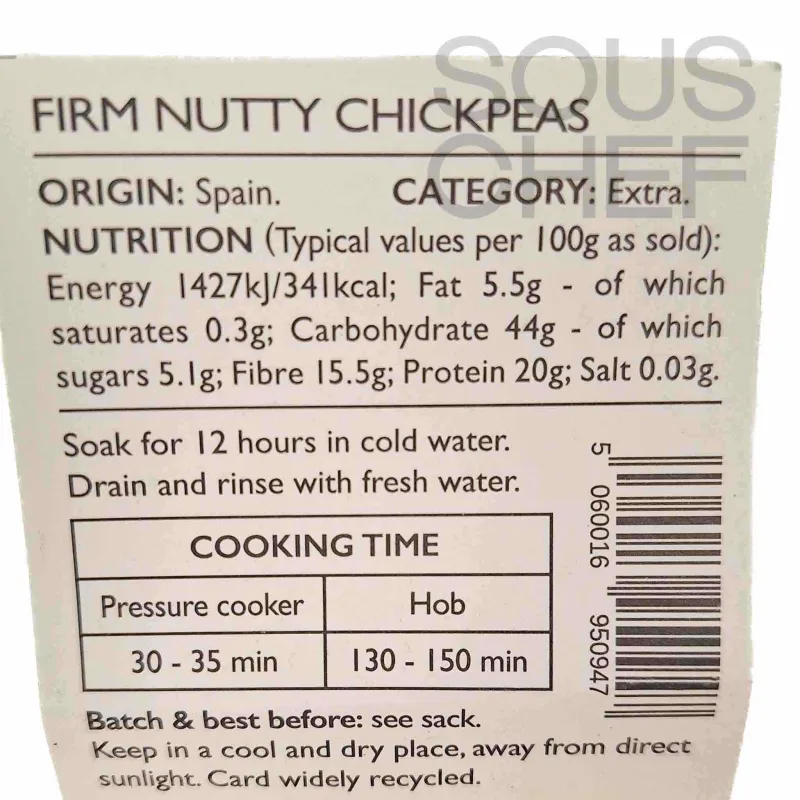 To cook the chickpeas, soak them in cold water for 12 hours. Drain and rinse with fresh water. They will cook in 130-150 minutes on the hob or 30-35 minutes in a pressure cooker.