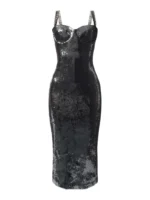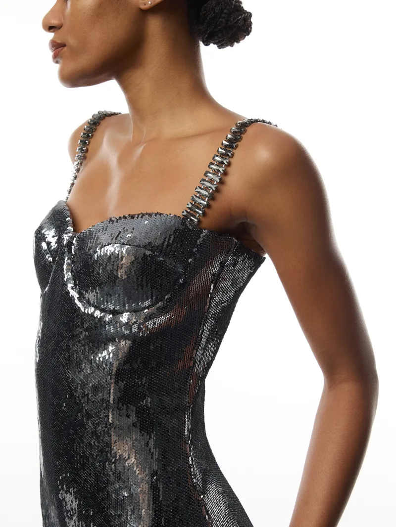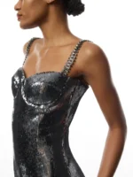 BROOKE is a bodycon midi dress with a corset style bodice. Crafted from high-shine liquid silver sequin, this figure-hugging silhouette features internal boning to the front, back, and sides for a contouring fit. Finished with jewel- embellished detachable straps, satin lined cups, and a concealed zip to the centre back. Fully lined for a smooth fit.