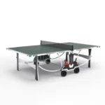 The 6mm melamine playing surface provides a consistent and extremely good bounce and playability for an outdoor model. A protective, strong galvanised steel frame with stable green corner pieces makes this table a robust and sturdy piece. Both halves fold into a central undercarriage for easy set-up and movement with 5″ double wheels. The undercarriage is galvanised to ensure the bottom of the table is strong for when it is folded upright. Height adjusters on all four legs have been placed in order to ensure a level playing surface and coming with a double-locking system for safety and stability.