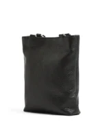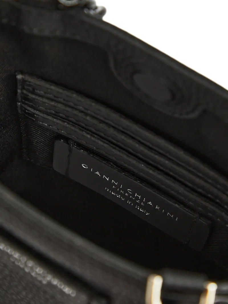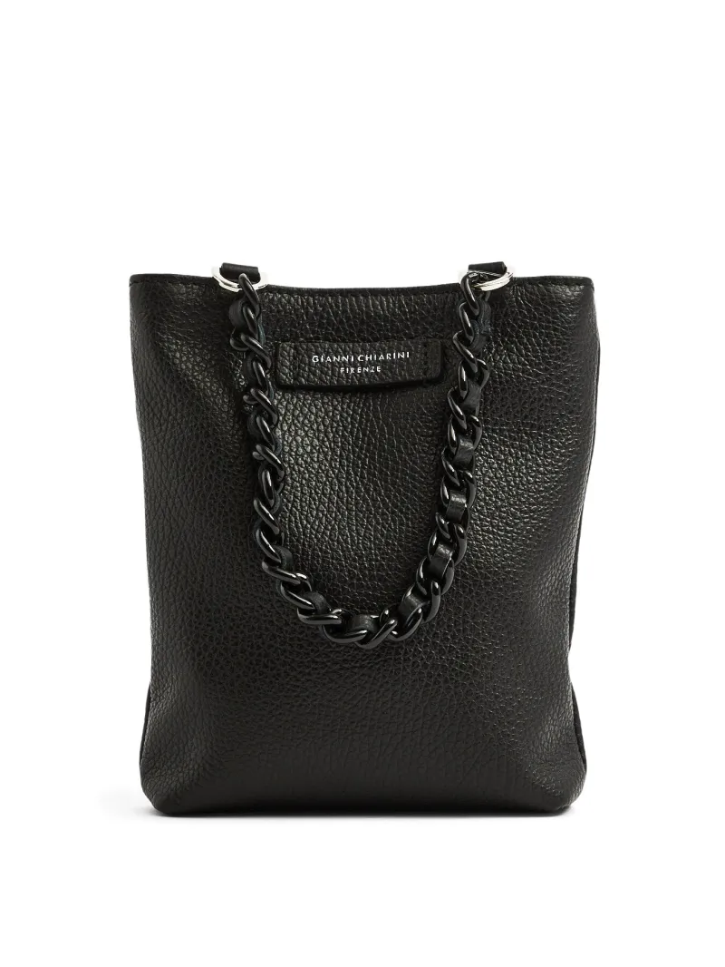 Camilla mini bag in pebble grain leather with a color matching double metal chain handle. Single compartment with interior pocket. Color matching leather shoulder strap to wear the bag cross-body.