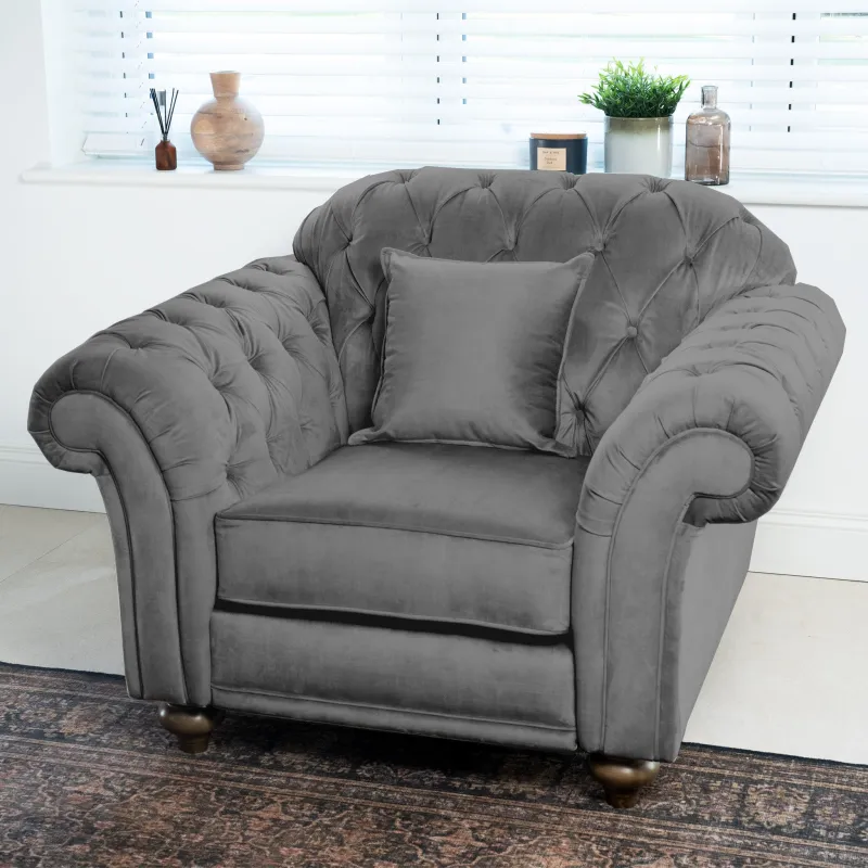 Lift your living space with the Chesterfield Velvet Armchair in Steel Grey, and effortless blend of refinement and luxury.