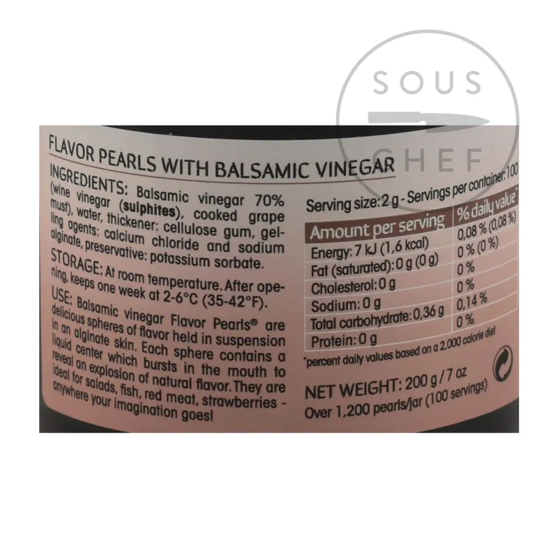 Product formulations and details may change. For the latest ingredients and allergen information always check product packaging prior to consumption. Ingredients: 50g: Balsamic vinegar 70% (wine vinegar (sulphites), cooked grape must), water, thickener: cellulose gum; gelling agents: calcium chloride, sodium alginate; preservative: potassium sorbate. 200g: Balsamic vinegar 70% (grape vinegar (sulphites), cooked grape must) (EU) 70%, water, thickener: cellulose gum; firming agent: calcium chloride, gelling agent: sodium alginate.