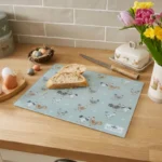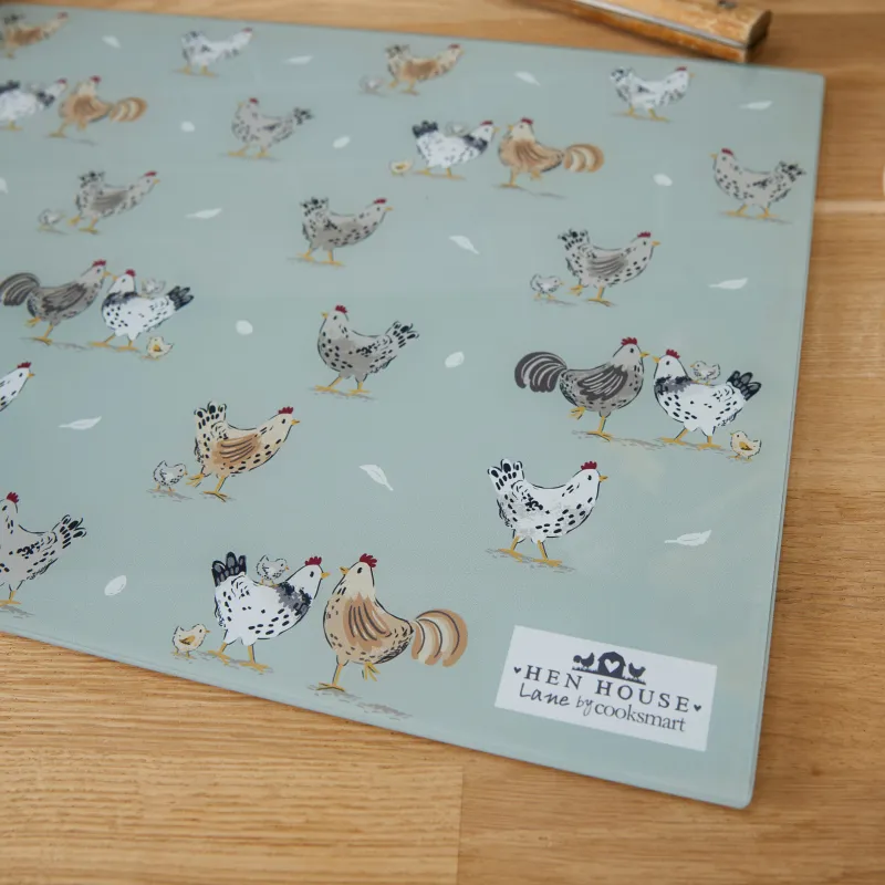 Transform your kitchen with this beautifully designed glass worktop saver. It’s not just practical for protecting against heat, scratches, and stains, but also adds a charming countryside vibe to your space. The lovely farmhouse print of hens, roosters, chicks, eggs, and feathers on a sage grey background will make your kitchen feel like a fresh seasonal escape. Part of a coordinated aesthetic design range, this durable glass worktop saver is a must-have for any passionate home cook. Specifications: made from glass, measures 40 x 30cm, hand wash only.