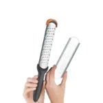 The Cuisipro Coarse Rasp Grater has a unique grooved grating surface which reduces resistance making grating effortless. By elongating the length of each individual blade it has a larger cutting surface. Non-slip grip handles and ends allowing grating stability and ease of use. The snap-on, clear protective covers catch grated ingredients and provide instant storage.