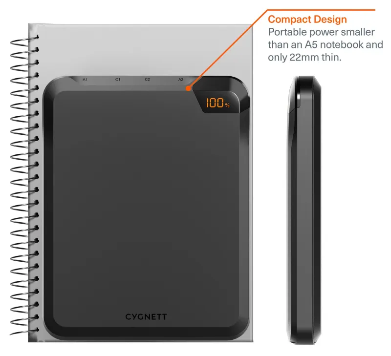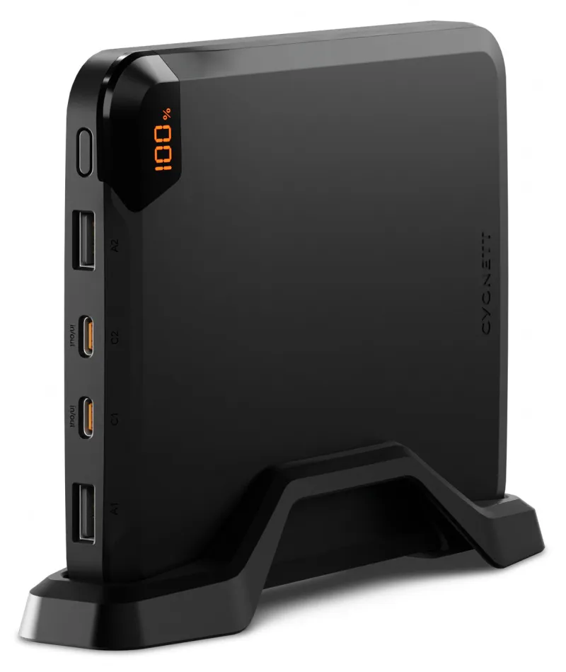 This sleek, portable laptop Power Bank is designed to fit easily in your bag or sit neatly on your desk with its removable stand. Its compact size occupies minimal space on any flat surface where you want to work. This powerhouse delivers up to 100W charging power, either to a single device or shared across four USB charging ports, allowing you to charge up to four devices simultaneously.