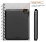 This Power Bank boasts a slim profile and includes a convenient stand, enabling it to stand upright and occupy minimal space on your desk or in your bag.
