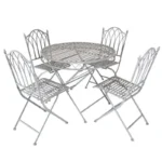 This cleverly designed bistro set is beautiful in its simplicity and an ideal choice if you are shopping for exceptional value without compromise on product quality. Ideal for those who love spending time outdoors and want a garden that will wow guests.The Deco collection will effortlessly complement any garden with a sleek design and durable build.This bistro set is perfect for creating a dining space within a smaller section of your garden, terrace or balcony. A flexible and stylish addition to any outdoor space. The biggest advantage of metal outdoor furniture is that its incredibly durable. As an especially robust material, unlike plastic, metal makes a great choice for patio furnishings, since you wont need to replace it too often as long as its well cared for. Itll stay looking great on the decking for years to come. You and 3 others will be able to relax, enjoy snacks, and chat in the sunshine.This stylish bistro set will suit perfectly in your garden, patio or deck, adding a touch of distinction to your outdoor area. This set is so elegant that you’ll have every guest asking you about them. For your comfort the chairs are fully foldable, so they don’t take up much space when not needed. The antirust finish on this garden bistro set guarantees a long lifespan, helping it withstand all outdoor weather conditions.Product SpecificationProduct Type: Bistro SetMaterial: Wrought IronColour: GreyPattern / Finish: PaintedNumber Of Seats: 4Seat Style: PatioPadded Seat: Not ApplicableCushion Colour: Not ApplicableCushion Pattern: Not ApplicableTable Shape: CircleGlass Table Top: NoParasol Included: NoAssembly Required: YesAdditional featuresIncludes: 4 Seater Bistro / Dining setMaterials: Wrought IronDimensions: Chair: H93 x D53 x W43cmTable: H74 x Dia.90cmHeight from chair seat to floor:43cmWeights: Table: 19kg1 Chair: 6kgChair maximum user weight:110kgColour: GreySome self-assembly required. Full instructions provided.Aftercare instructions includedLifestyle images and accessories shown are for illustration purposes only.