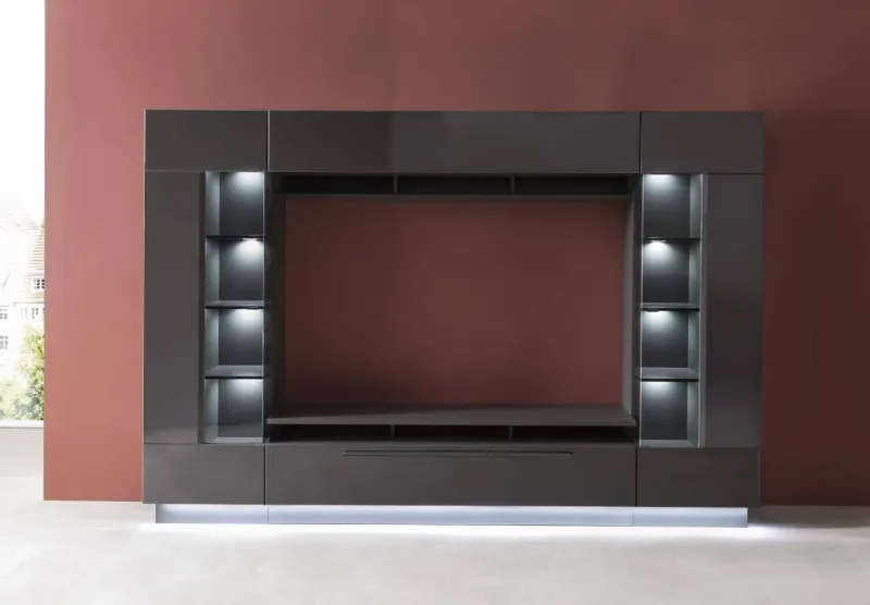 Maximize your living room space with this streamlined and ultra-modern entertainment unit. With a total of thirty-two compartments equally spread across, this furniture bundle offers a lot in terms of convenience, beauty and modernism. Its unmatched allure is created by the magnificent gloss of graphite and lustrous fronts, both contributing to a polished and shiny appearance. The space provided by the unit is likewise plenty with eight of the compartments being strategically-located display sections, four on each of the vertical sides of the structure. These can be lit up with LED lights to highlight their contents and captivate attention. For media, magazines and books, there is a pair of shelves at the top and bottom of the inner structure – they both divide the space into six shallow cuboids.