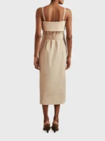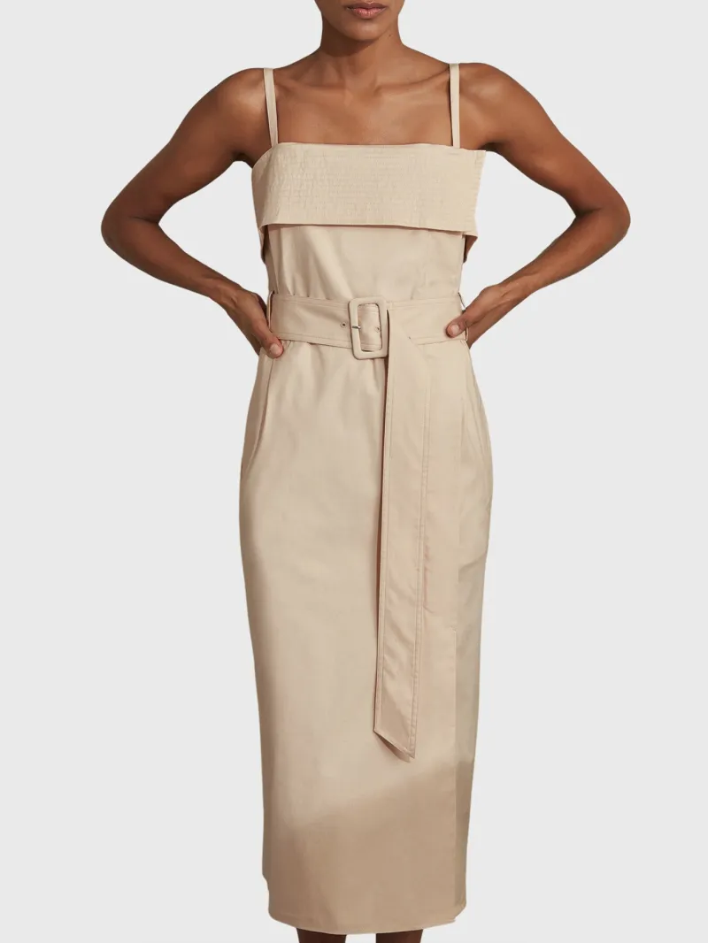 The Dhalia is crafted from a structured cargo-style cotton blend and arranged into a pencil shape with added volume at the hips. This wrap-style dress features a fold-over bust element and an adjustable waist belt.Fold-over bust element Top-stitch detailing Adjustable shoulder straps Adjustable waist belt Side pockets Wrap-style Side splitZip-closure to sideMidi length