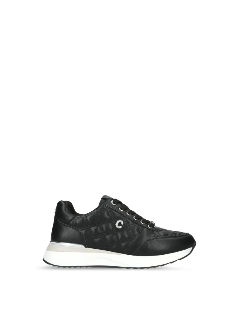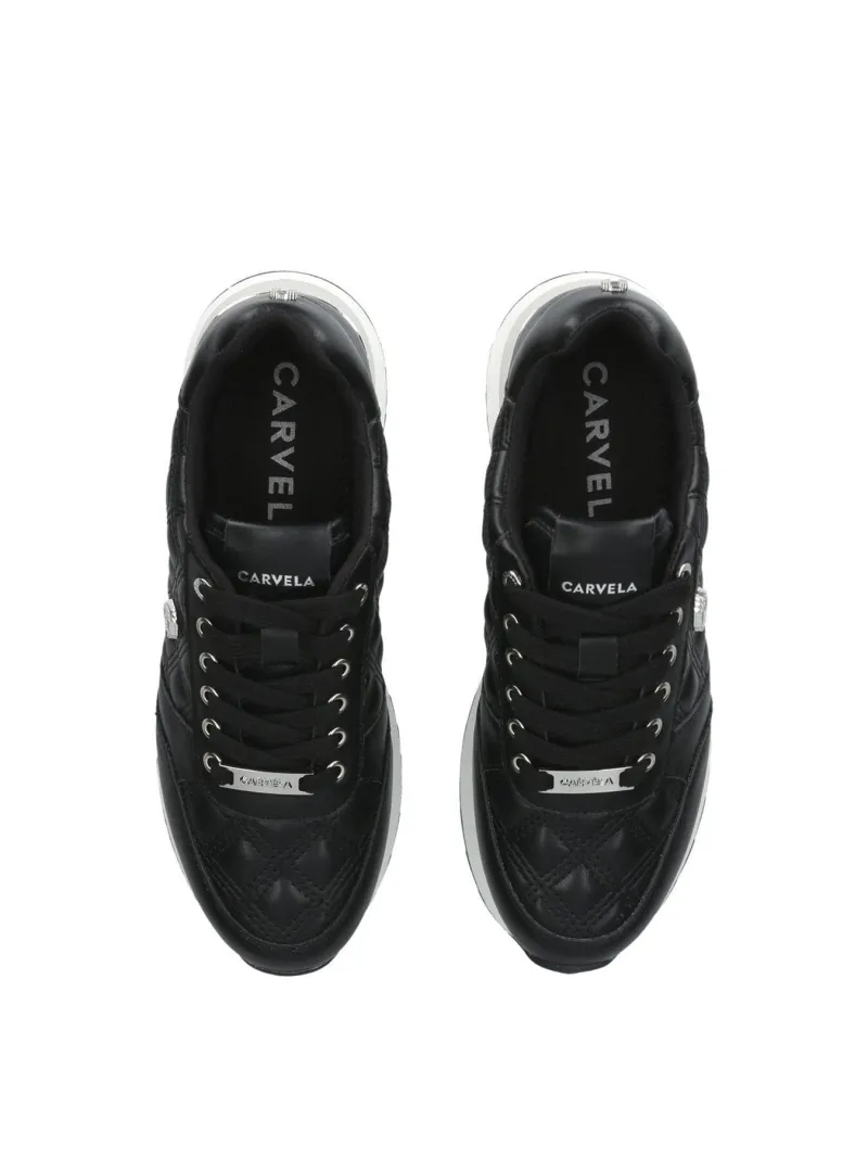 This Carvela Diamond Quilted Runner trainer features a black upper with overstitch quilt in a diamond design. The front laces up with the gold eyelets matching the branding details seen across the upper.