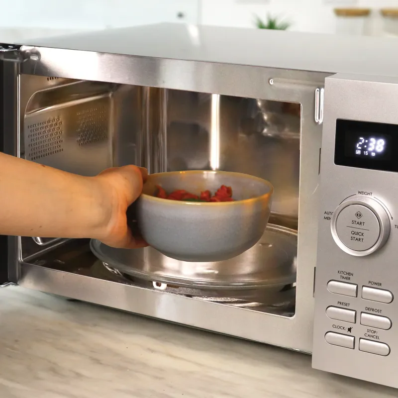 The Statesman 20 Litre Digital Solo Microwave is compact and efficient, available in black or silver finishes. Its stainless steel cavity enhances cooking and longevity. With 8 auto cooking programs, 11 power levels, and a 95-minute timer, it offers versatility. Features include Quick Start, speed/weight defrost, a clear LED display, and a mute function.