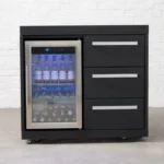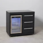 The Draco Grills Fusion Outdoor Kitchen Black Fridge and 3 Drawer Cabinet with Sintered Stone Top can be used as a stand-alone unit or as part of a larger outdoor cooking area. It comes equipped with a fridge and a smart set of 3 drawers at the side.