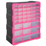 This 39 Drawers Storage Cabinet is a perfect tool and parts organiser. For use in garage, repair-store, shed or workshop. Built with tough polypropylene for long-term durability. Drawers are transparent so you can easily see what’s inside and find your tools quickly. And each drawer comes with a built-in stop to prevent anything falling out. It can be used as a free-standing cabinet or mounted on the wall. Slotted holes are drilled in the cabinet to facilitate wall mounting. A quick and easy way to organise small accessories with easy access.