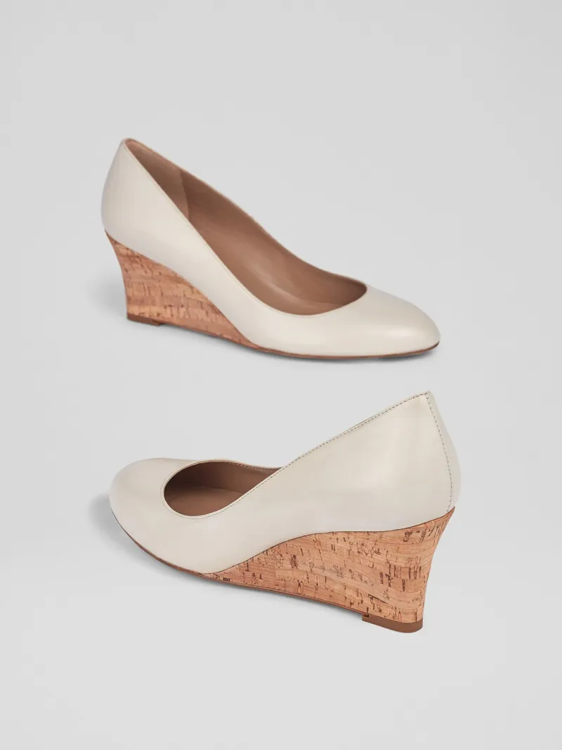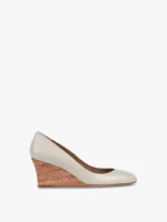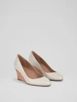The Eevi wedges are crafted in Spain from nappa leather in ecru. They have a round toe, a sleek shape and a 65mm cork wedge heel.