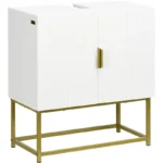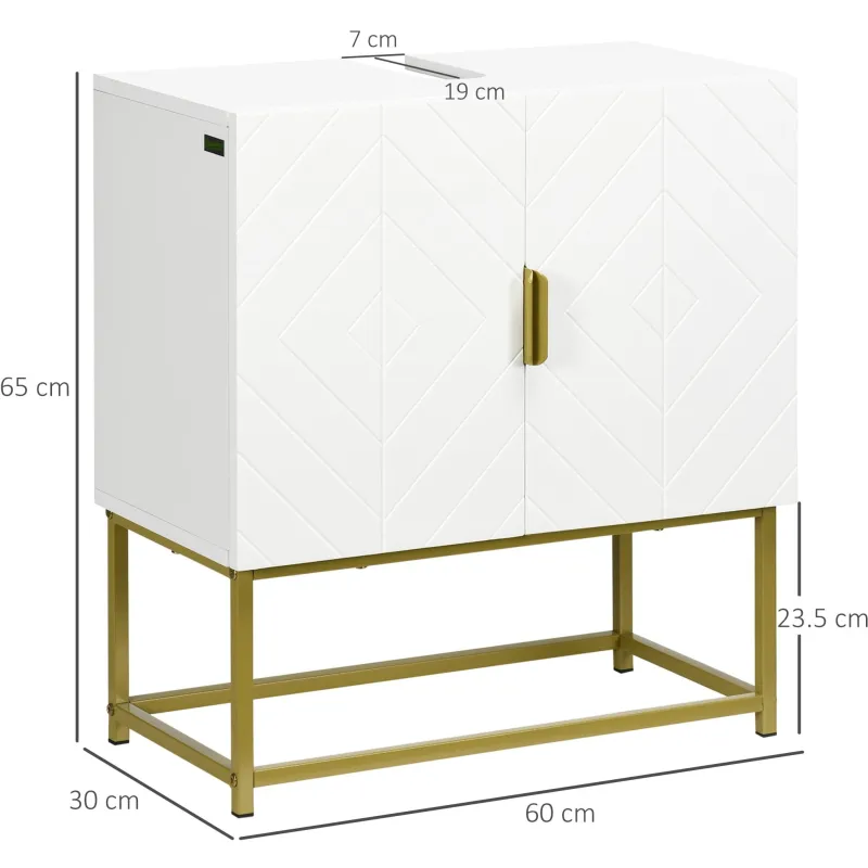 Store bathroom essentials in style, under the sink: do it with this kleankin cabinet. ‘U’ shaped cut-out to fit underneath the sink. Main compartment for handy, discreet storage. Clean white structure, with embossed doors for gentle character; finished with a gold-coloured bottom for chic points.