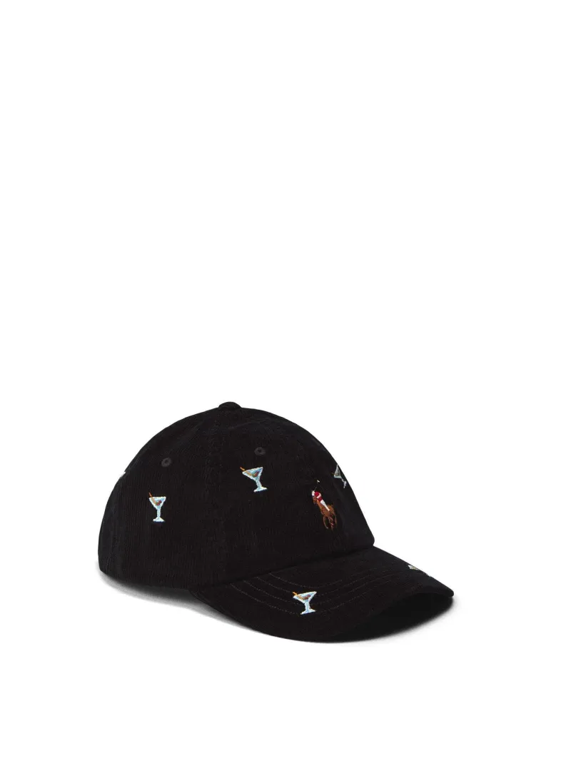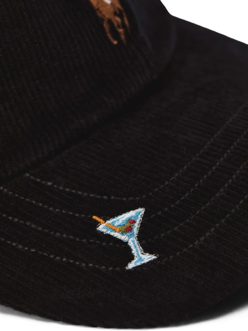 In stretch cotton corduroy, this ball cap is embroidered all over with a playful motif of martini glasses. A leather strap finishes the back.Seamed bill. Cotton twill underbill.Six-panel construction.