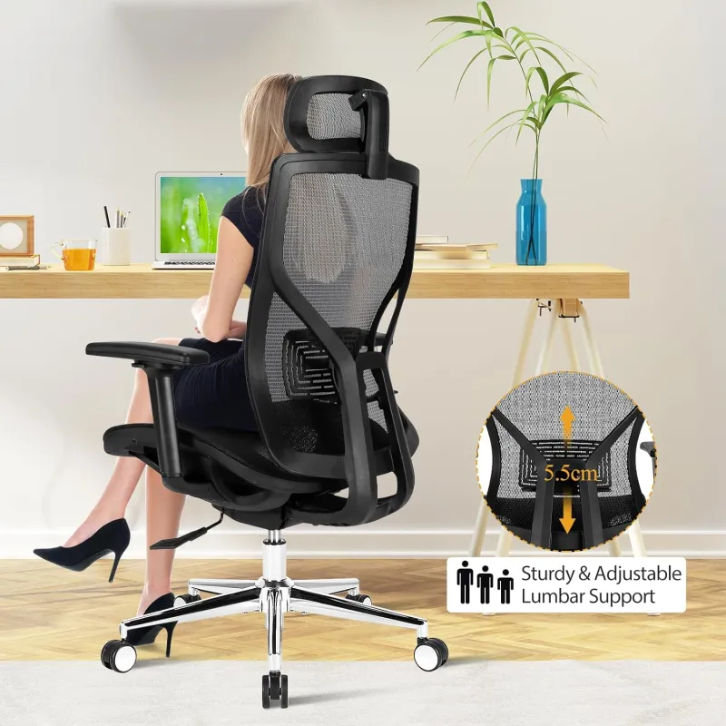 Refresh your office space with this ergonomic swivel chair for computer desks and workstations. This ergonomic office chair is made from quality breathable mesh and 5-claw base, which provide strong support while ensuring air circulation, so you can stay cool and comfortable even after sitting for a long time. The S-shaped backrest mimics the human spine which helps release the spinal pressure, with more effectively lumbar support to cherish. Multiple adjustments of this computer chair help you to find the comfortable seating position. The adjustable headrest, 3D armrests and back tilt provide you with better support when you sit on our computer chair. 360° swivel wheels give you the freedom to move around your home or office without noise. A great choice for office workers, or students to act as a computer chair, office chair, or meeting chair! Ergonomic High Back with Lumbar Support: Adopting S-shaped ergonomic high backrest that mimics the natural shape of the spine, the home office chair supports your back to increase comfort. The adjustable lumbar support can protect the lumbar vertebra so as to relieve fatigue. This desk chair backrest also supports 90° to 110° tilt adjustment. Multiple Adjustments: Numerous adjustable features provide you a customized seating experience. The 45-degree rotating headrest features 5.5 cm up and down adjustment, helping relax your head after work. This 3D adjustable armrests – go forwards and back, up and down, and rotate 15° for best fit to your desired position. Breathable Mesh Chair with Sliding Seat: The breathable mesh backrest and seat promote air circulation and keep you cool all day long. The waterfall edge of the office chair can relieve pressure and promote blood flow to your legs. Meanwhile, the 7 cm adjustment of seat depth provides a comfortable sitting feeling for users with various heights and weights. High Quality and Easy Installation: The high back computer chair features a stable 5-claw base that can withstand user’s weight up to 136 kg. The durable gas lift provides reinforced stability and safety that you can lift up and down smoothly and quietly. All the installation accessories and a detailed manual are provided for convenient and easier assembly. 360° Swivel Casters for Easy Mobility: The computer office chair is equipped with quality PP casters, enabling you to move freely in the home office area, no damage to your wooden floor. This swivel chair provides convenience like chatting with others or taking something. This modern computer chair is perfect for all workplaces like home, office, conference room, etc.