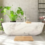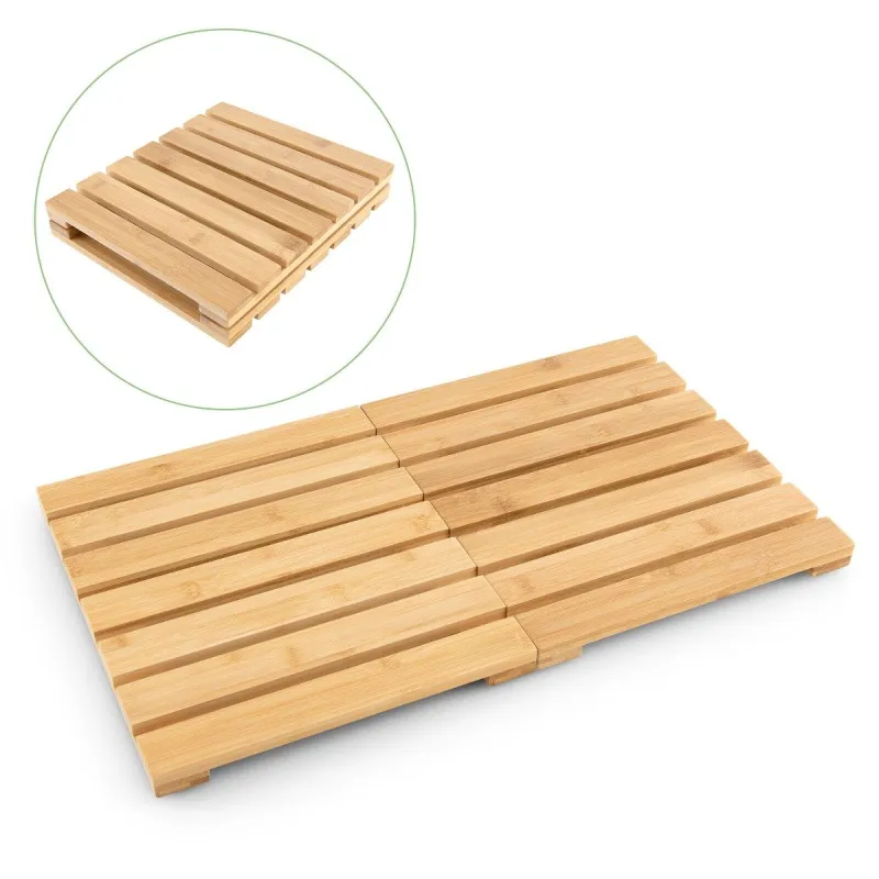 This waterproof and non-slip bamboo bath mat can let you have a comfortable and safe shower! Made of 100% natural bamboo material with firm connection, this shower mat ensures great stability, water resistance, and high deformation resistance, which can serve you for a long time. The smooth bamboo finish is not only aesthetic, but also makes it comfy to step on the mat. 8 anti-slip foot pads help to secure the shower mat in place as well as protect your floor from scratches. Besides, our bath mat features a self-draining slatted design for reducing water accumulation and quick drying. This floor mat can be easily folded into a compact size for easy storage and transportation. It is perfect to be used beside the pool, sauna, hot tub or in the shower room, entryway, etc. To prolong the service life, please remember to wipe clean the surface and air dry in an upright position after each use. If you are looking for such a product, don’t hesitate to place an order! Slatted Fast Drying Board: The slatted shower board ensures great ventilation that can dry quickly keeping the mat from mould. Also with raised legs, this shower mat offers good drainage and effectively avoids your feet soaking in water and brings you a nice place to dry your body. Foldable and Lightweight Design: You can conveniently store and carry the outdoor shower mat because the mat can be folded that you can store the mat in the corner and it’s light enough for you to take. The premium hinge between two boards ensures smooth opening and closing actions. Comfortable Smooth Surface: Compared to the tile floor and fabric mats, the bamboo floor mat is much more comfortable to touch and keeps your feet away from wet and cold surfaces. In addition, the smooth surface has no burrs and obvious nail holes, which protects your feet from scratching. Selected Material and Non-slip Pads: The bathroom shower mat is made of selected natural bamboo which is environment-friendly and durable for long-lasting service. Considering safety, the back of this bamboo bath mat is equipped with 8 non-slip foot pads which offer a good grip on the ground and thus prevent movement while standing on the bath mat. No Assembly and Easy Maintenance: This duck board is ready to use when you received that you can use the mat without any operation. The waterproof surface is easy to clean that you only need to rinse the bamboo shower mat under water and stand the mat upright to dry.