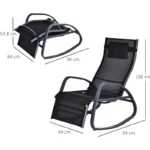 Striking the balance between comfort and style, let this rocking chair from Outsunny be your go-to spot outdoors. The tough and durable metal frame is made into a comfortable wide design, where the armrest blends into the curved base, allowing you to glide forwards and backwards gently. Adjustable to five different positions on the back, and three for the footrest, with the breathable mesh seat giving a firm place to sit on and relax. A removable pillow to provide support to your head and neck.