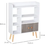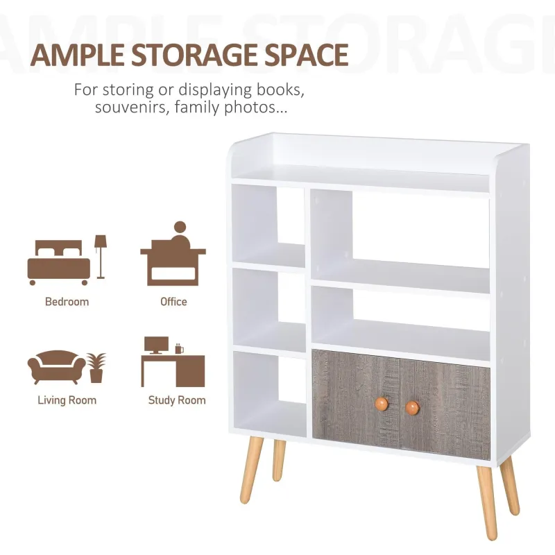 Say hello to beautiful and simple storage with this bookcase from HOMCOM. Made from particle board for a solid structure, it’s formed with two open shelves, three small open cubes, a double-door cabinet and and a wide surface top – plenty of room for keeping books, plants, photos, candles etc on. Pine wood legs in an outward-angled manner help create balance and sturdiness. A great way to enhance your living space whilst getting everything organised.