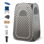 Control options include the remote control and the control panel. With 9-level temperature control from 35 to 63℃, it provides efficient heating and can ease physical pain, relieve fatigue, or reduce stress. Moreover, it has a 9-level timer to ensure safe auto shutoff. The 3L steam generator features an explosion-proof 2-layered tempered glass lid, anti-scalding handle, no dry heating function, and overheat protection. The 4-layered waterproof fabric provides soft touch and great durability. The roll-up zippered door ensures easy access and the zippered window promotes the air circulation. The package contains sweet accessories, like remote control, medicine box, carrying bag, and more. By the way, the foldable chair can support up to 200 lbs. Bullet Point: Fogging Mode and Stainless Steel Liner: Enjoy the efficient heating with the sauna tent, equipped with a powerful steam generator that boasts a fogging function to facilitate skin absorption of mist and achieve smooth skin. Besides, you can freely add vinegar, ginger, or salt to the stainless steel inner pot, which is fairly durable. 9-Level Temperature and Sauna Benefits: Cater to your personal comfort with the pop up home sauna’s 9-level adjustable temperature from 35 to 63℃. This precise control enables you to find your desired sauna temperature for ideal pain relief, skin improvement, stress relaxation, and more. Dual Controlling Ways and 9-Level Timer: With the remote control and smart control panel, you can take full control of the portable sauna tent. Therefore, it is convenient to adjust the 9-level timer from 15 min to 90 min. There is also a storage bag to store the remote control or your phone when you are not using it. 3L Steam Generator for Safe Using: Safety is a top priority; the steam generator has an unlocked 2-layered tempered glass lid to avoid accidental explosions. Moreover, the indoor sauna kits feature an anti-scalding handle, no dry heating design, and overheat protection, further improving the using safety. Waterproof Fabric and Zippered Design: The sauna tent is made of 4-layered fabric that is waterproof, long-lasting and feels comfortable. Furthermore, it comes with a roll-up zippered door for easy access, while its zippered window ensures exceptional air circulation as needed. Pop-Up Frame and Sweet Accessories: Conveniently, the sauna box features a pop-up design, ensuring tool-free setup and easy portability. Meanwhile, it is equipped with complete accessories, including a medicine box, a foot massager, a mat, a storage bag and a sauna chair that can support up to 90 kg.