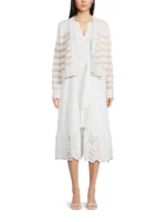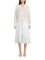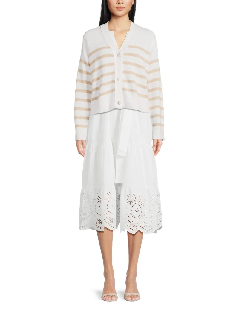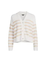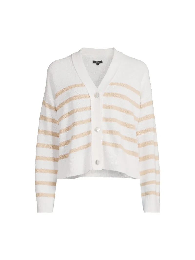 A cotton blend cardigan featuring large natural shell buttons, the Geneva has a sand-striped design for a neutral aesthetic that is suitable for layering.
